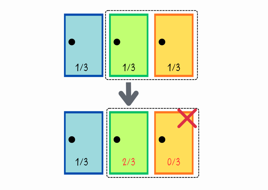この場合、残った扉の確率はどうなるかというと … 実は50%ずつになるんです。